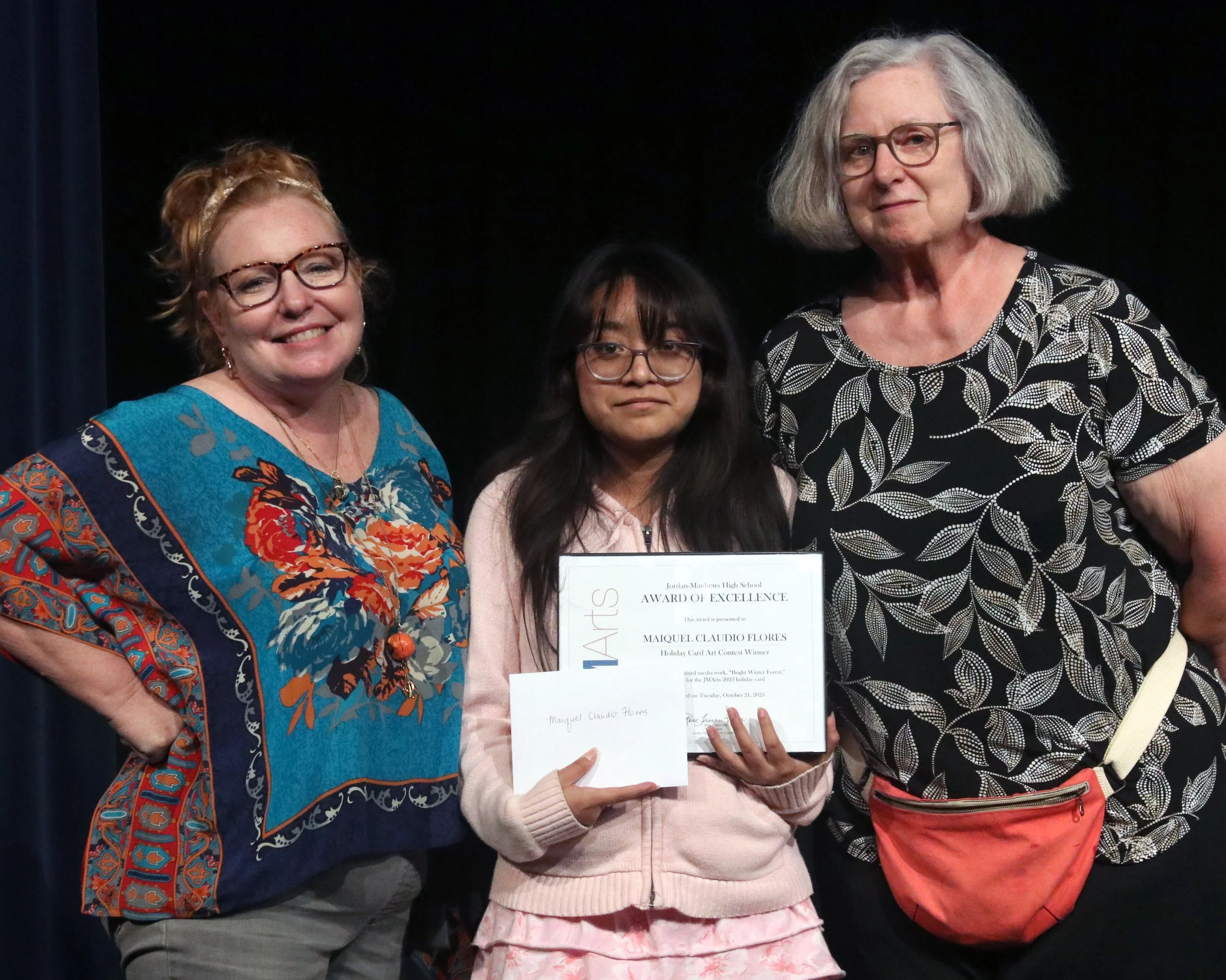 Artist Maiquel Claudio Flores, center, receives her award certificate and $100 check from art teacher Laura Newman, left, and JMArts President Rose Pate. (Photo by Chip Pate)