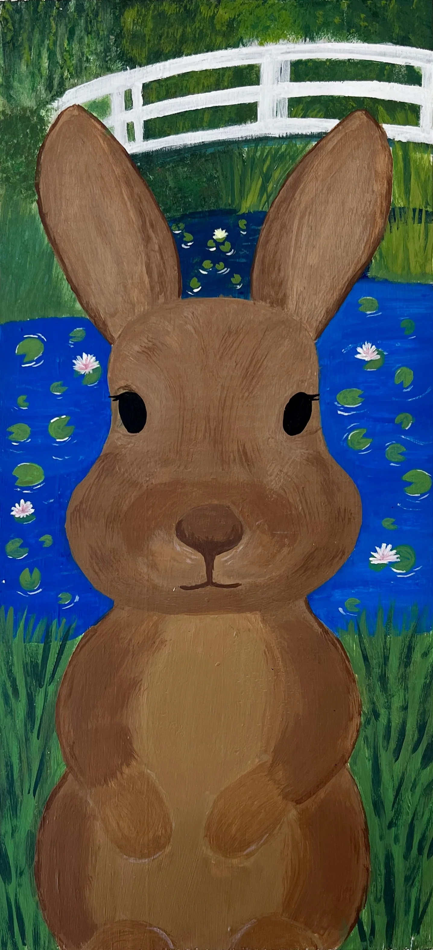 My rabbit is inspired by Claude Monet and his famous painting “Bridge over a Pond of Water Lilies.” I liked his style and how they look realistic but at the same time you can see the brush strokes. I tried to make it my own by incorporating the bridge and water lilies.