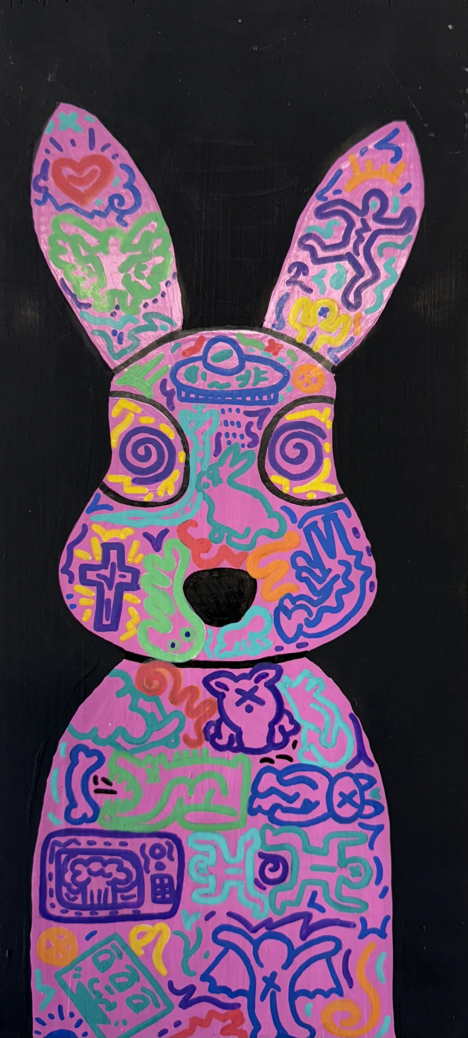 Keith Haring was the inspiration for my rabbit. What stood out to me the most about his art was the simple but also coordinated and a little complex style to his art. The elements of my art that I tried to highlight were the different colors and Keith-inspired doodles on every inch of the rabbit.